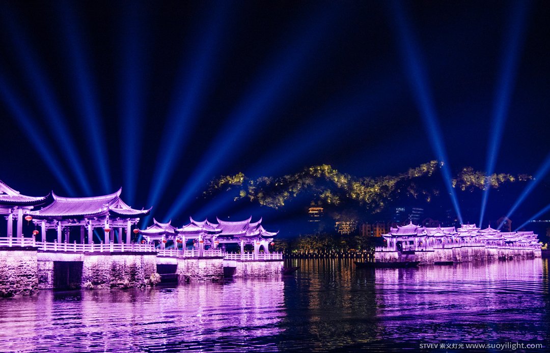 为了凸显古亭的特有建筑风格,实现色彩丰富的灯光效果,整座桥体安装了1万多套RGBW系列,单点单控的LED瓦楞灯、LED投光灯、LED洗墙灯,为光影秀的创作提供了更多的可塑性。
