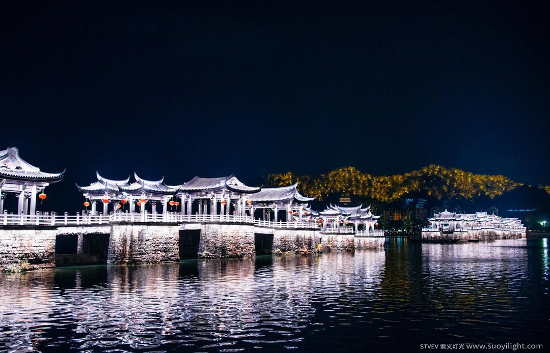 广济桥集梁桥、浮桥、拱桥于一体,是我国古桥的孤例,以其“十八梭船二十四洲”的独特风格闻名。灯光设计大气磅礴,富有层次感,利用层次、色彩展现不同楼台的造型特色,彰显广济桥的文化和历史韵味,使游人能够感受潮汕独有的民俗特色。